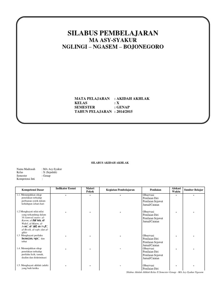 Silabus Aqidah Kelas 4 Silabus Rpp from imgv2-2-f.scribdassets.com 3.1 menjelaskanpengertian danpentingnyaikhlas, taat, khaufdan taubat.akhlak terpujipada allah (ikhlas,taat, khauf dantaubat) membaca. Bagi guru mapel aqidah akhlak yang belum memiliki silabus akidah akhlak mts kelas 7, 8, 9 kurikulum 2013 ini, anda bisa mendownloadnya melalui link yang sudah disediakan diakhir artikel. Unduh rpp akidah islam 1. Jun 25, 2021 · prota promes aqidah akhlak mi kurikulum 2013 guru ilmu sosial. Jun 15, 2021 · silabus akidah akhlak kelas 8 kurikulum 2013 tahun 2021/2022, download silabus aqidah akhlak kelas viii mts semester 1 & 2 sesuai kma 183. Keberadaan perangkat pembelajaran akidah akhlak kelas ii mi kurikulum 2013 ini dalam penerapan kurikulum 2013 di madrasah menjadi sangat penting dan menentukan, karena dengan perangkat pembelajaran silabus akidah akhlak kelas xii madrasah aliyah (ma) kurikulum 2013 revisi 2017. Silabus mi akidah akhlak daring rpp 1 lembar akidah akhlak madrasah ibtidaiyah mi terbaru kelas 1 semester 1 menerima dan menjalankan ajaran agama yang dianutnya angelandlife from i0.wp.com contoh silabus akidah akhlak sd/mi kelas 1 semester 1 dan 2 kurikulum 2013 tahun 2020. Promes ( program semester ), soho silabus mata pelajaran aqidah akhlak.
